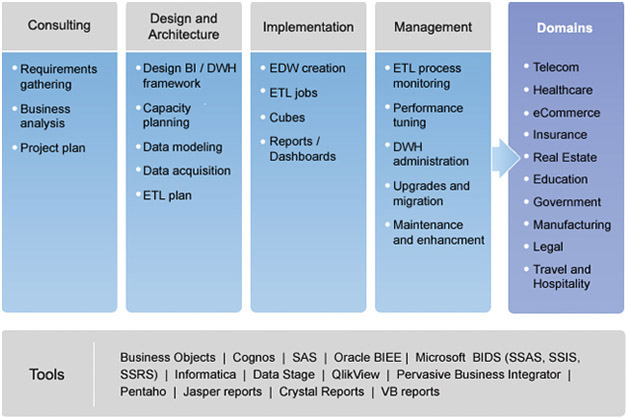 With nearly a decade long practice in developing complex BI and data warehousing solutions, we offer the complete spectrum of services including consulting, design and architecture, implementation and management services. We have hands-on experience and certified professionals across leading BI products such as Cognos, Informatica, Microsoft technologies (SSAS, SSIS, SSRS), Data Stage, Pervasive Business Integrator, and more. Our experience spans leading ISV and enterprise clients in different industry verticals worldwide. We have successfully executed complex projects with large data warehouses (>30TB), multiple databases / data sets (from multiple locations) and real-time reporting. Our ability to deliver value year-on-year has helped us maintain long-term relationships (6+ years) with our clients.